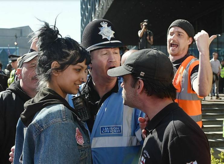 "¿Quién parece que tiene el poder aquí: la verdadera chica de Birmingham o el hombre de EDL que emigró a nuestra ciudad por un día y no logró integrarse?"